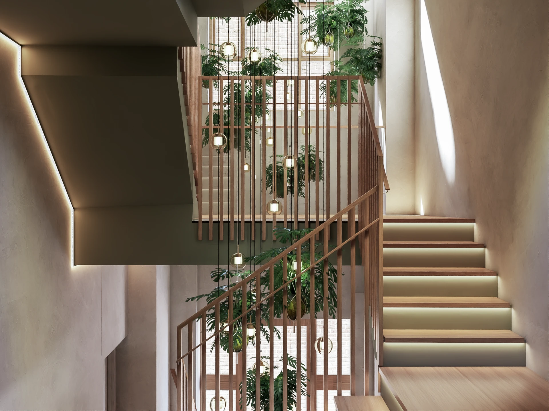 The Café Juice Bar takes inspiration for a Balinese style restaurant, incorporating a mixture of natural biophilic elements to create calming, grounding atmosphere. A mixture of wood, stones and flora help to evoke a connection to nature, whilst the neutral pastel colours offer a sense of calm.
