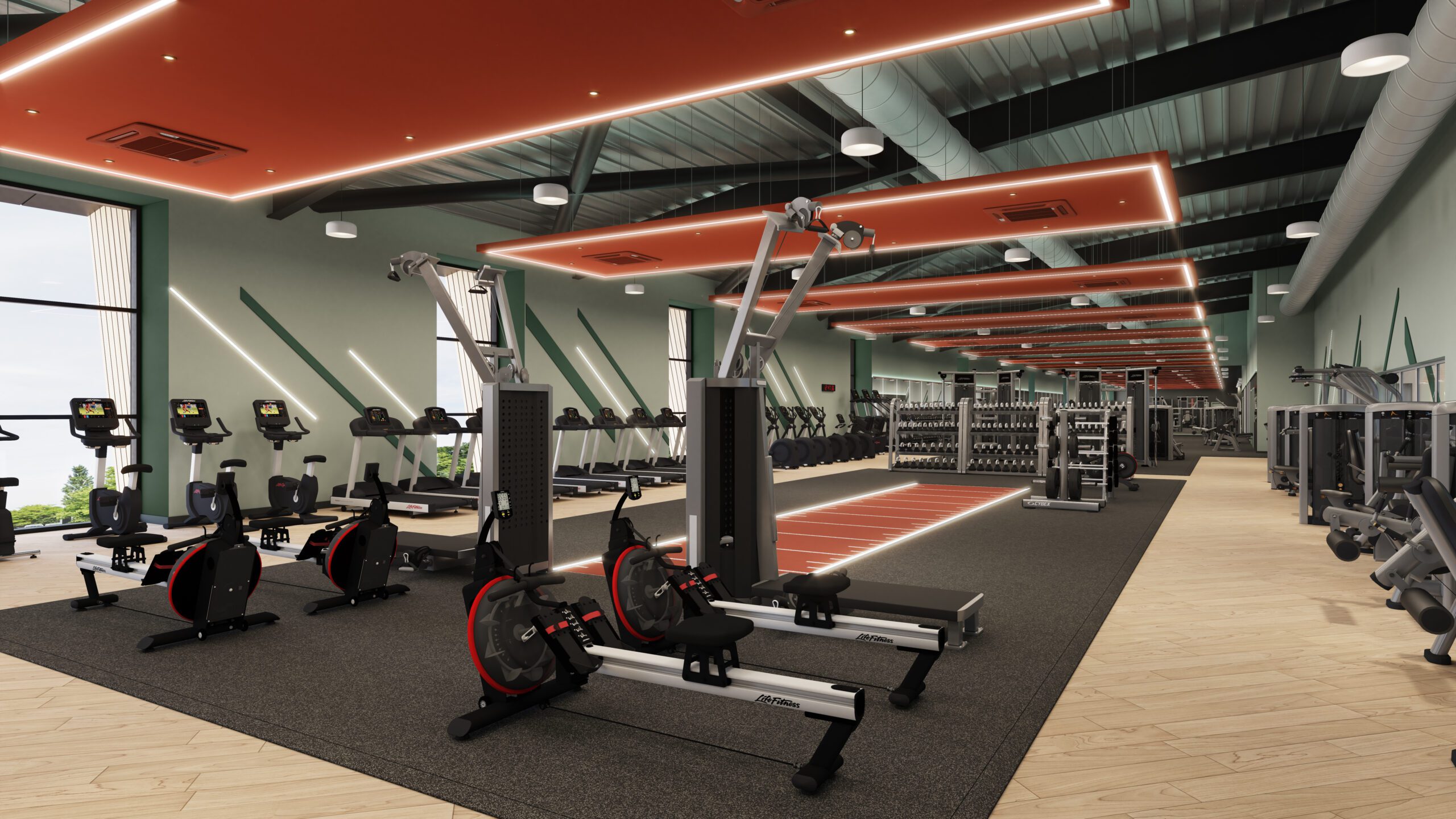 A key driver of the concept is dynamic lighting, featuring linear lights around ceiling rafts and track lighting to create a sense of movement and focus throughout the gym floor. Zoned flooring, including specialised turf for functional tracks and high-impact rubber, works in tandem with custom wall graphics and featured hygiene stations to balance professional-grade performance with a polished, premium feel.