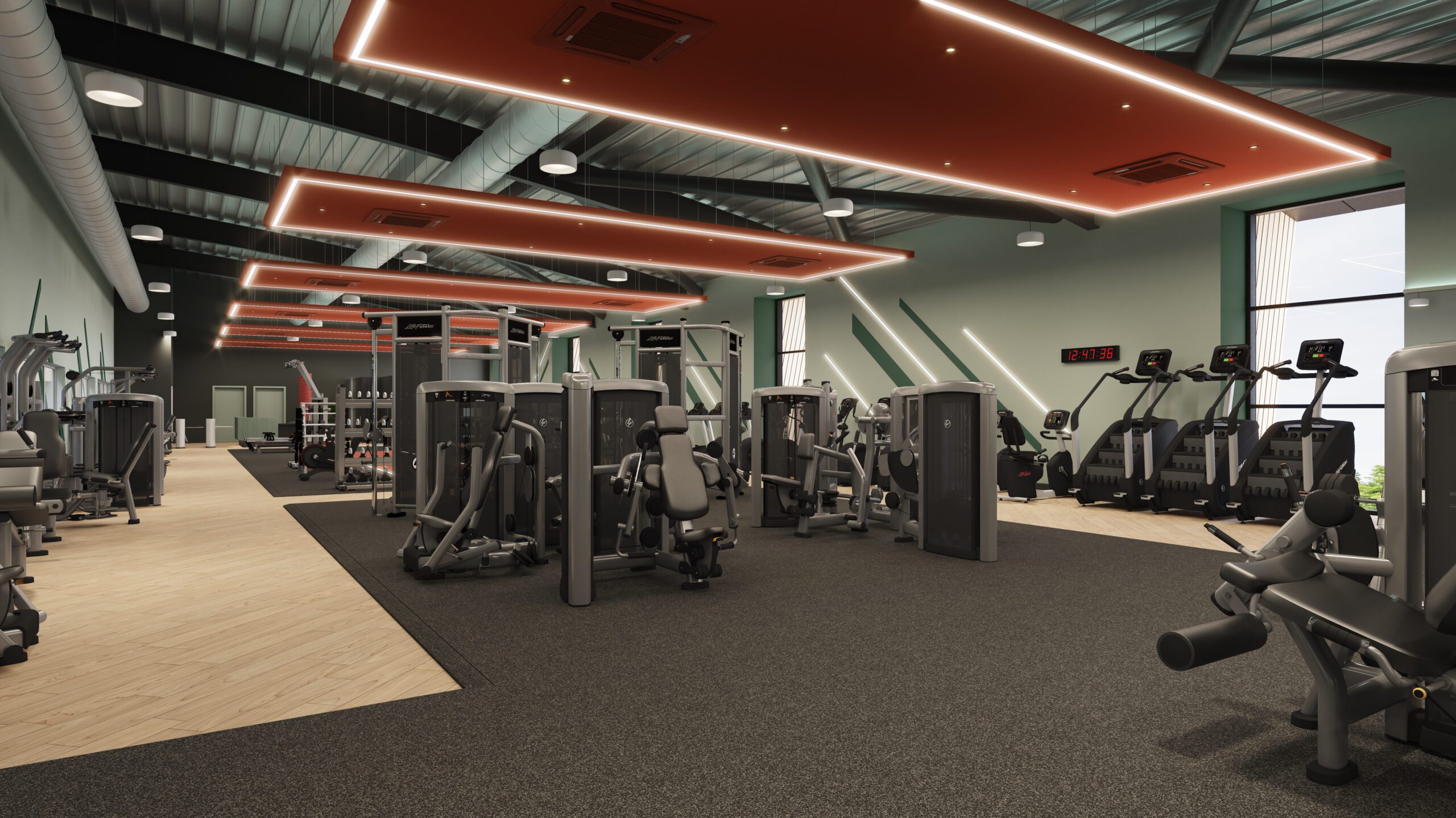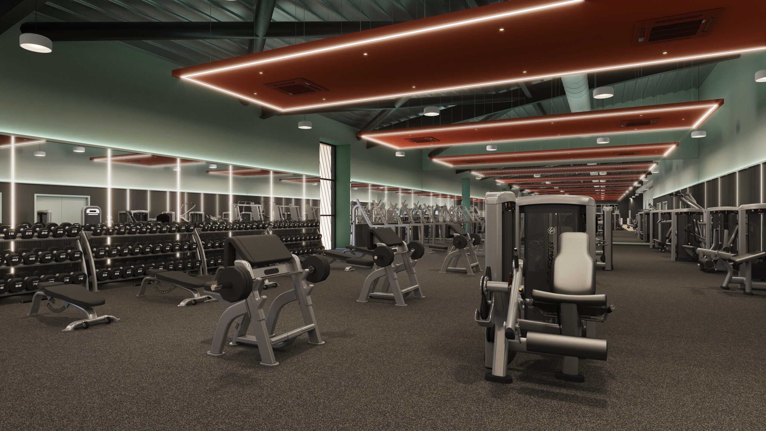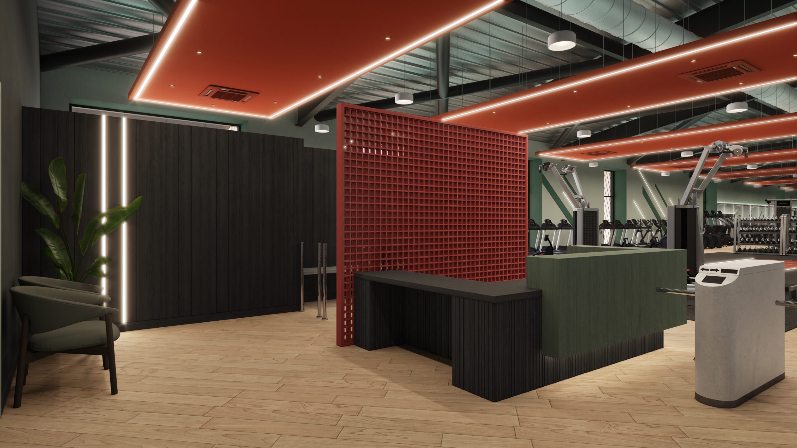 The entrance and waiting areas are designed to offer a warm, inclusive welcome. The reception features indirect lighting onto the soffit, painted ceiling rafts, and strategic planting to soften the industrial scale of the park. From the first impression at the reception desk to the final rep in the free weights area, the space fosters a sense of belonging and inclusivity, empowering a diverse community of users to thrive.